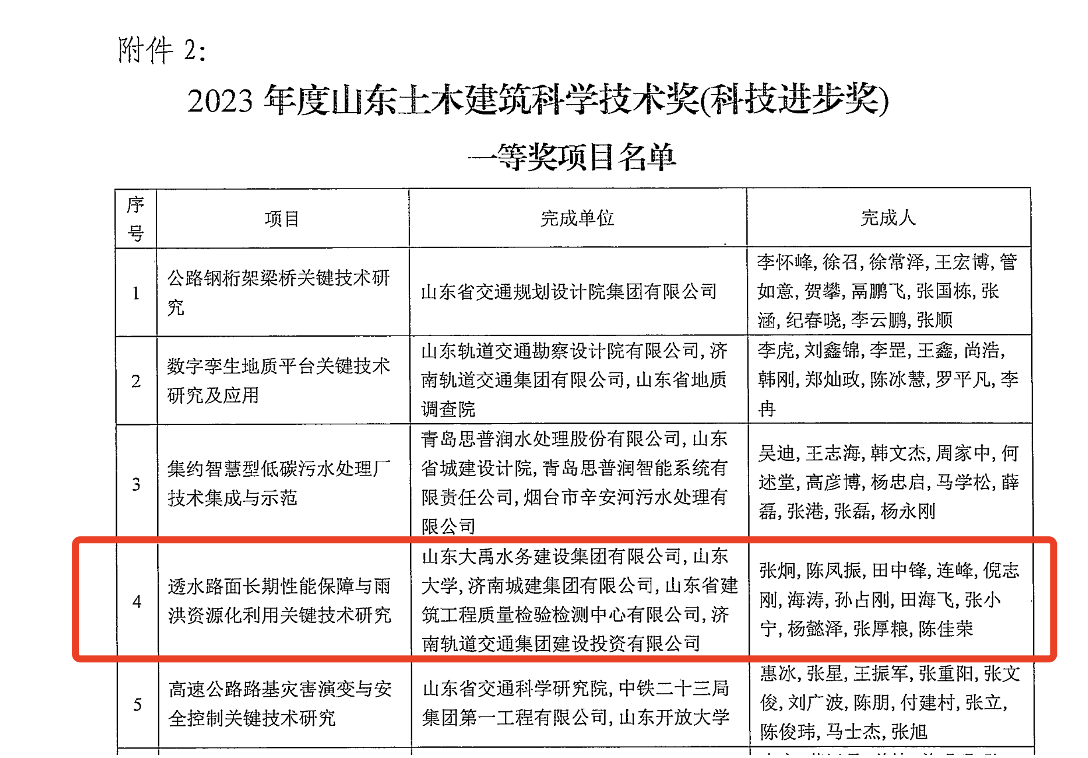 近日,山東土木建筑學會公布了“2023年度山東土木建筑科學技術獎(科技進步獎)獲獎名單”并頒發榮譽證書。由山東大禹水務建設集團有限公司等單位共同申報的“透水路面長期性能保障與雨洪資源化利用關鍵技術研究”項目榮獲“2023年度山東土木建筑科學技術獎”一等獎。