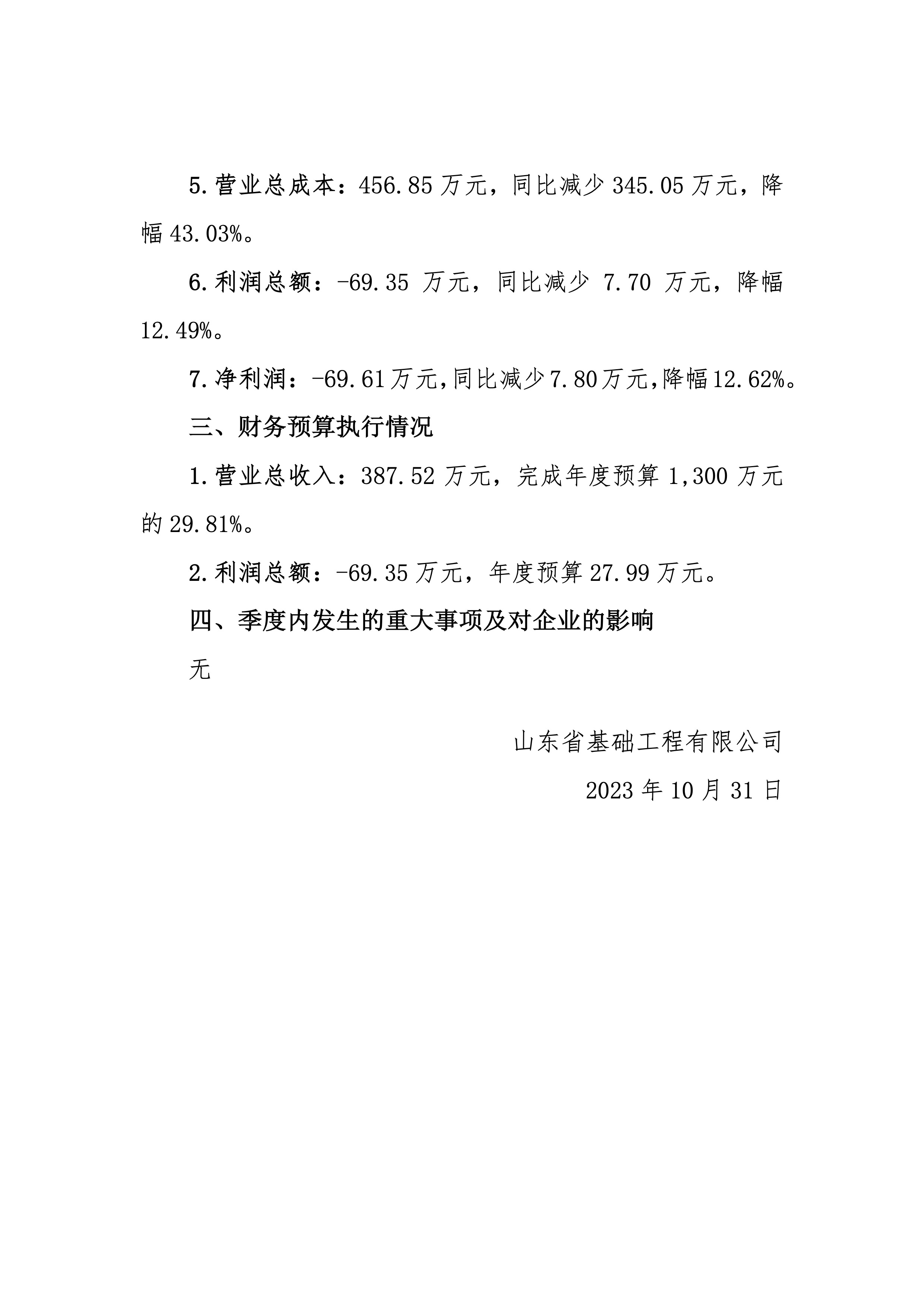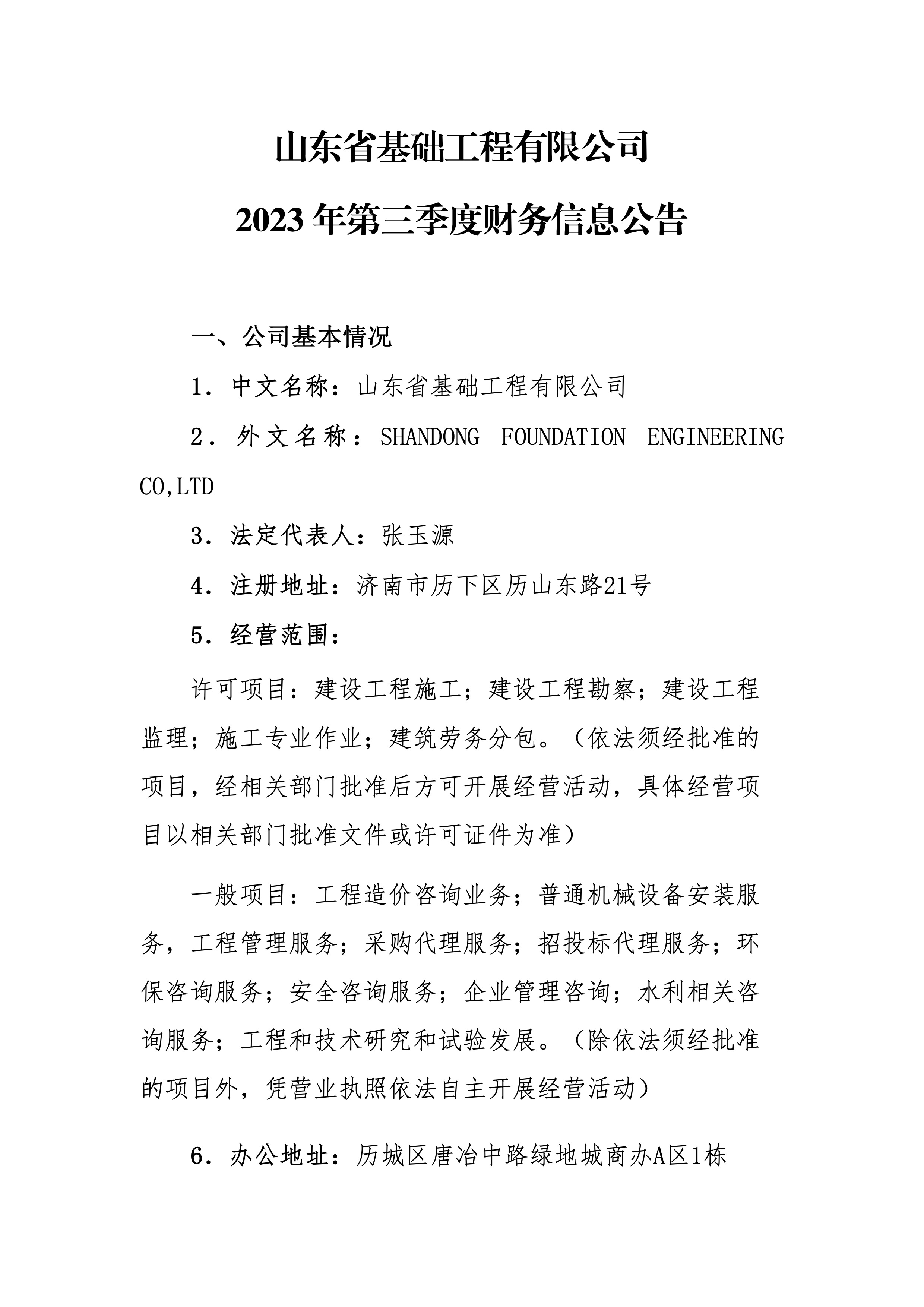 山東省基礎(chǔ)工程有限公司2023年第三季度財務(wù)信息公告