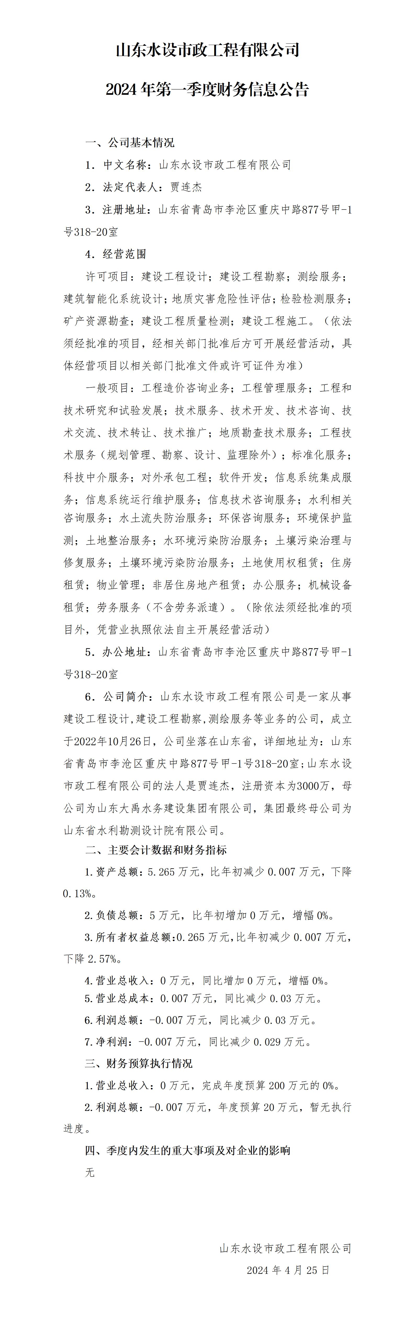 山東水設市政工程有限公司2024年第一季度財務信息公告