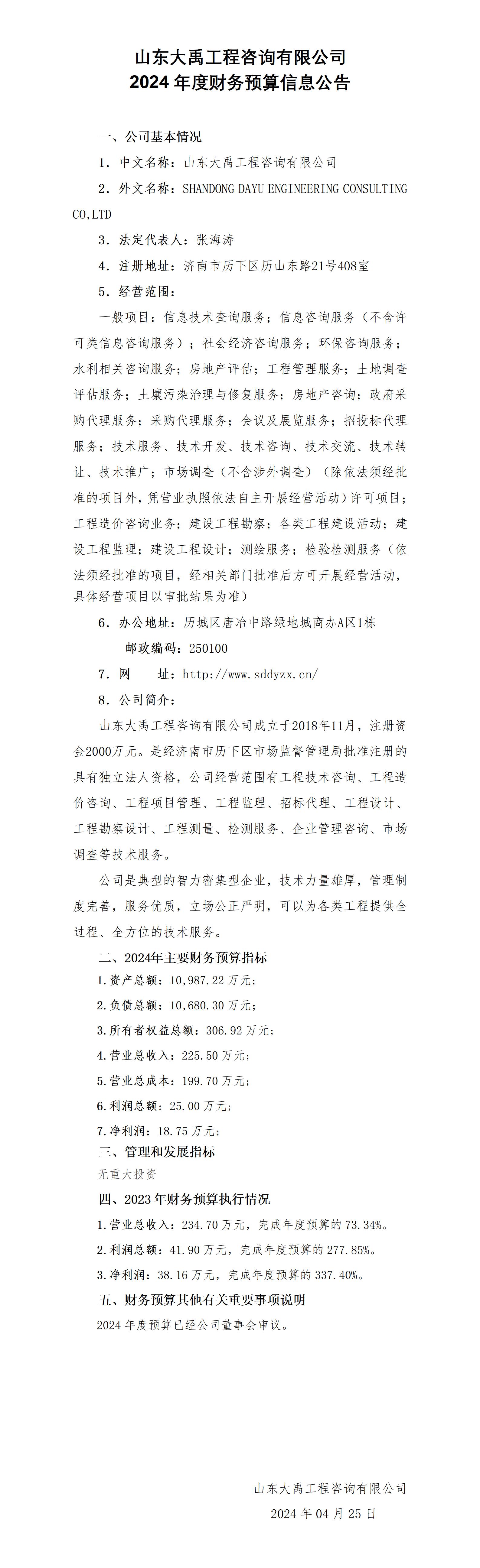 山東大禹工程咨詢有限公司2024年度財務預算信息公告