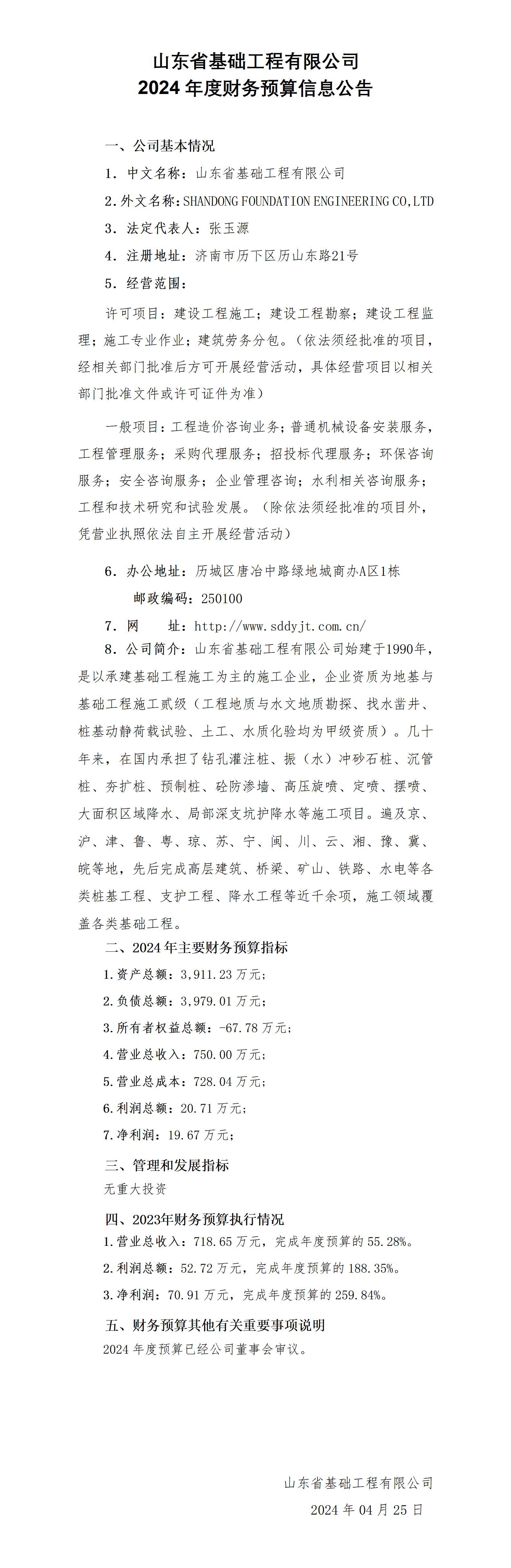 山東省基礎(chǔ)工程有限公司2024年度財(cái)務(wù)預(yù)算信息公告