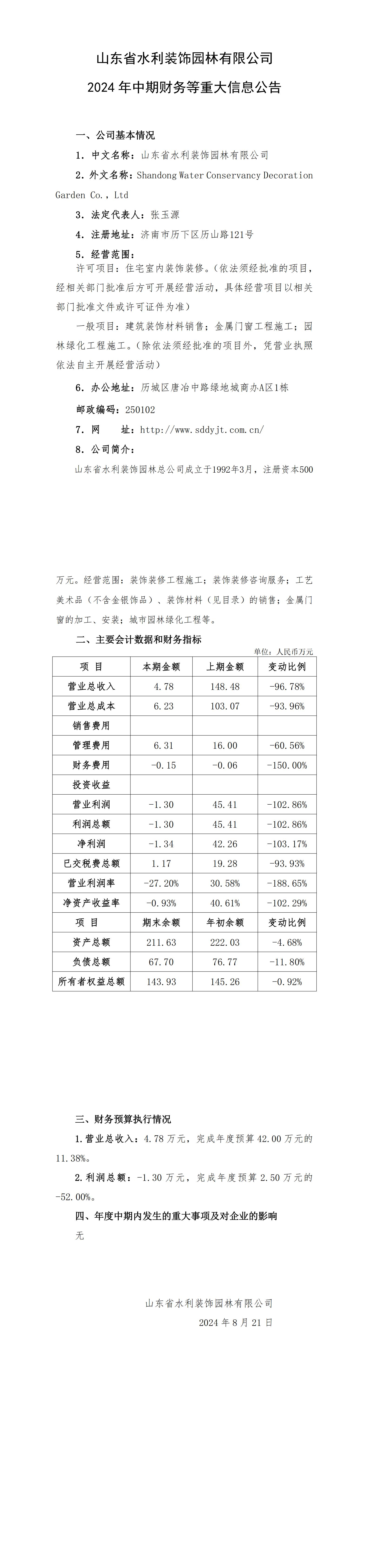 山東省水利裝飾園林有限公司2024年中期財務等重大信息公告