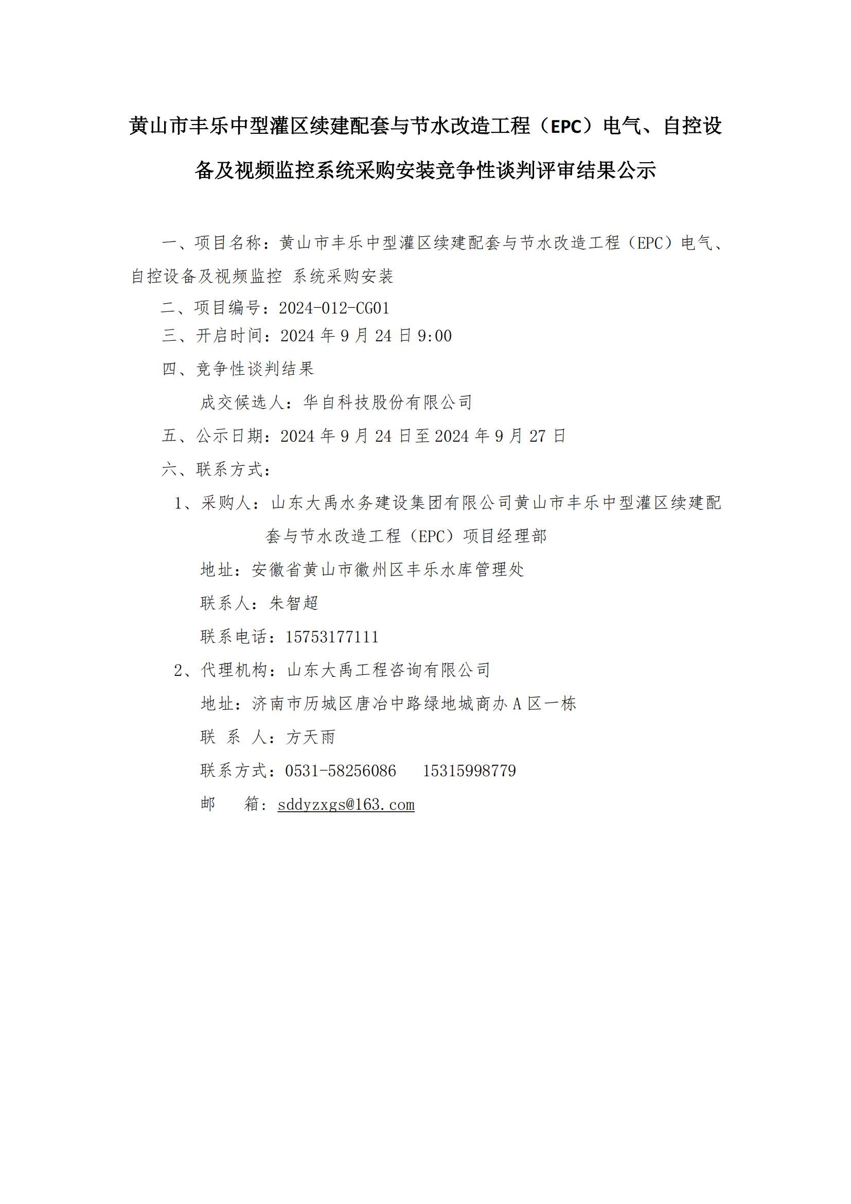 黃山市豐樂中型灌區續建配套與節水改造工程(EPC)電氣、自控設備及視頻監控系統采購安裝競爭性談判成交結果公示