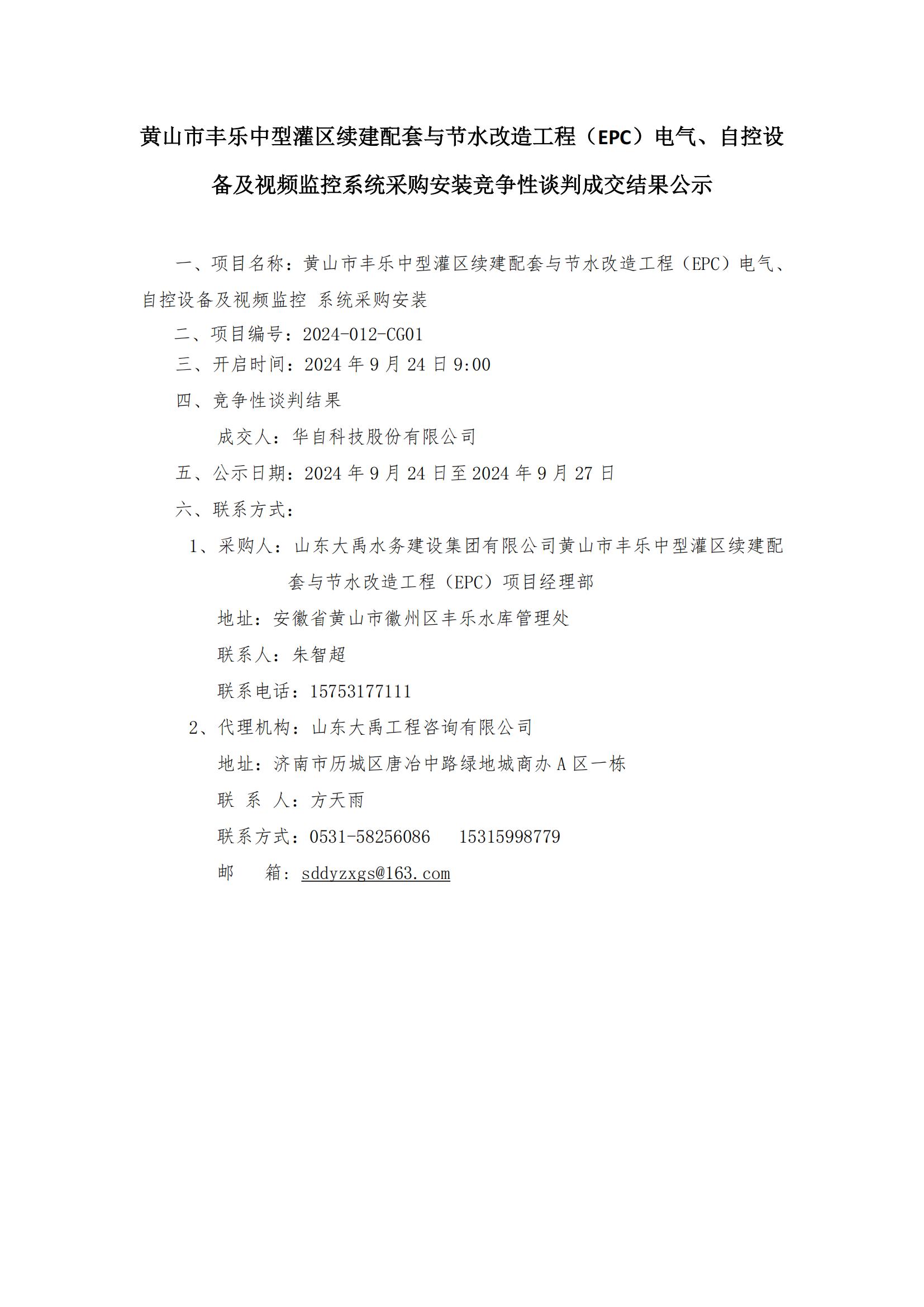 黃山市豐樂中型灌區(qū)續(xù)建配套與節(jié)水改造工程(EPC)電氣、自控設(shè)備及視頻監(jiān)控系統(tǒng)采購安裝競爭性談判成交結(jié)果公示