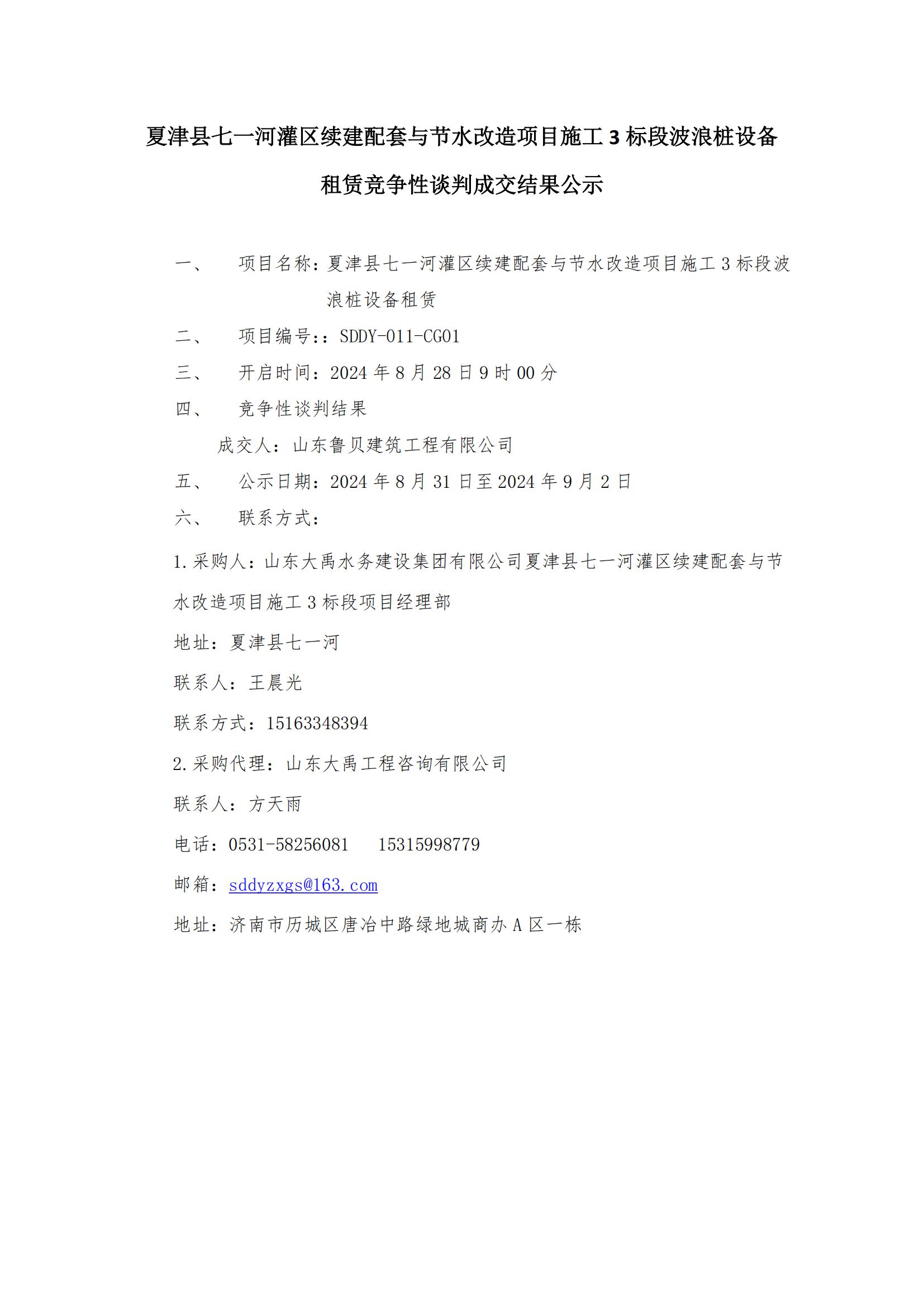 夏津縣七一河灌區續建配套與節水改造項目施工 3 標段波浪樁設備 租賃競爭性談判成交結果公示