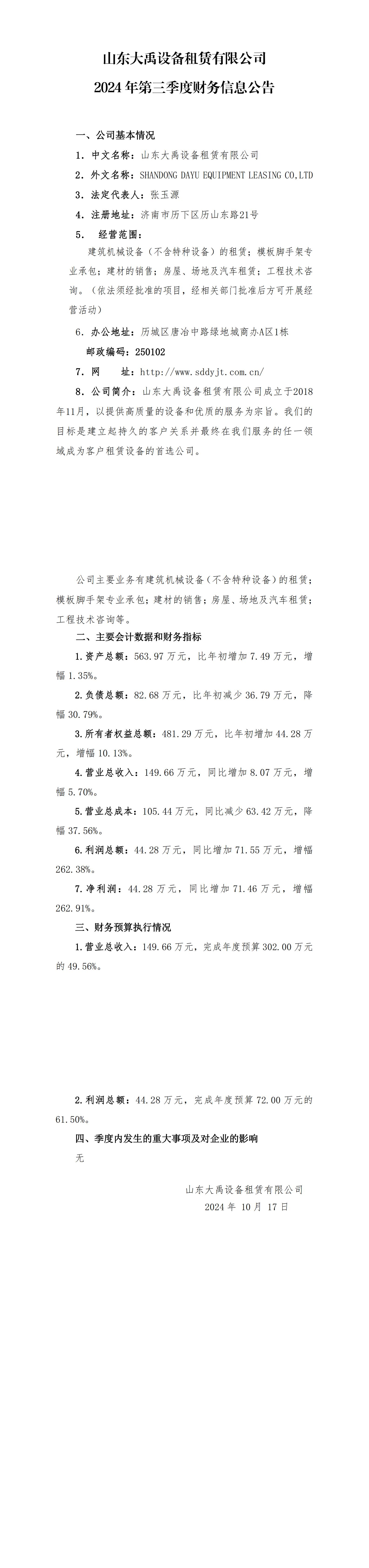 山東大禹設備租賃有限公司2024年第三季度財務信息公告