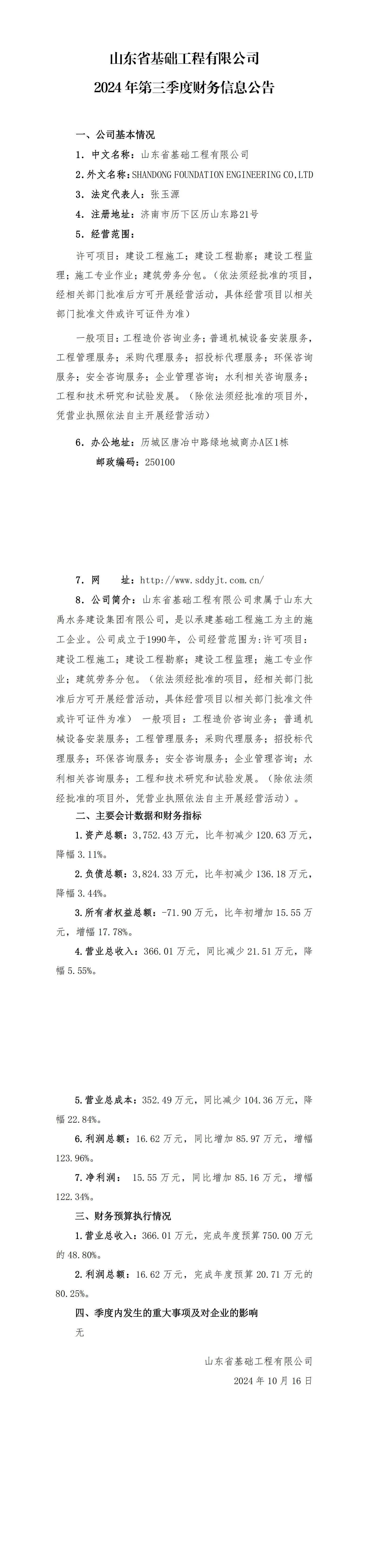 山東省基礎工程有限公司2024年第三季度財務信息公告