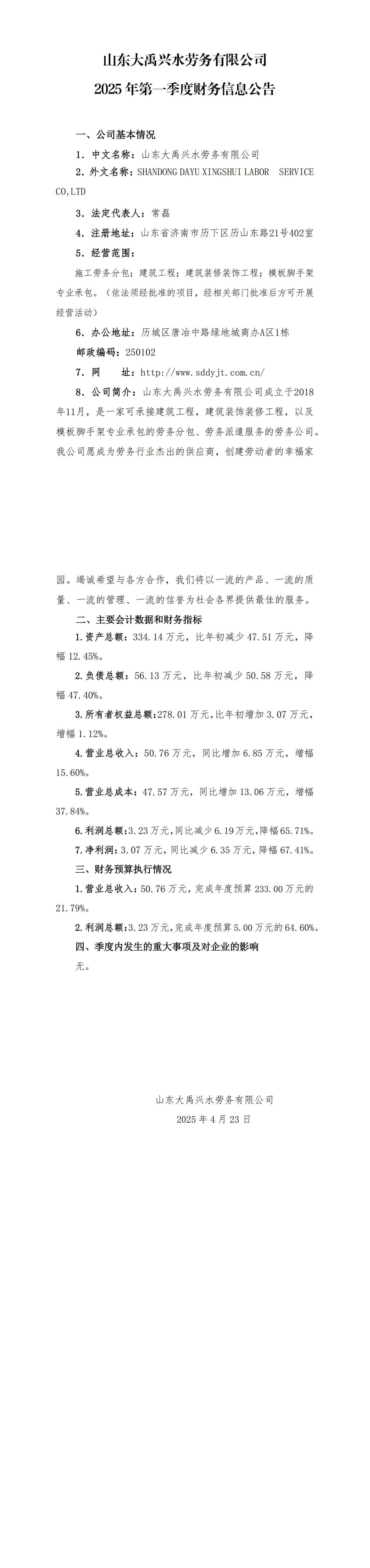 山東大禹興水勞務(wù)有限公司2025年第一季度財(cái)務(wù)信息公告