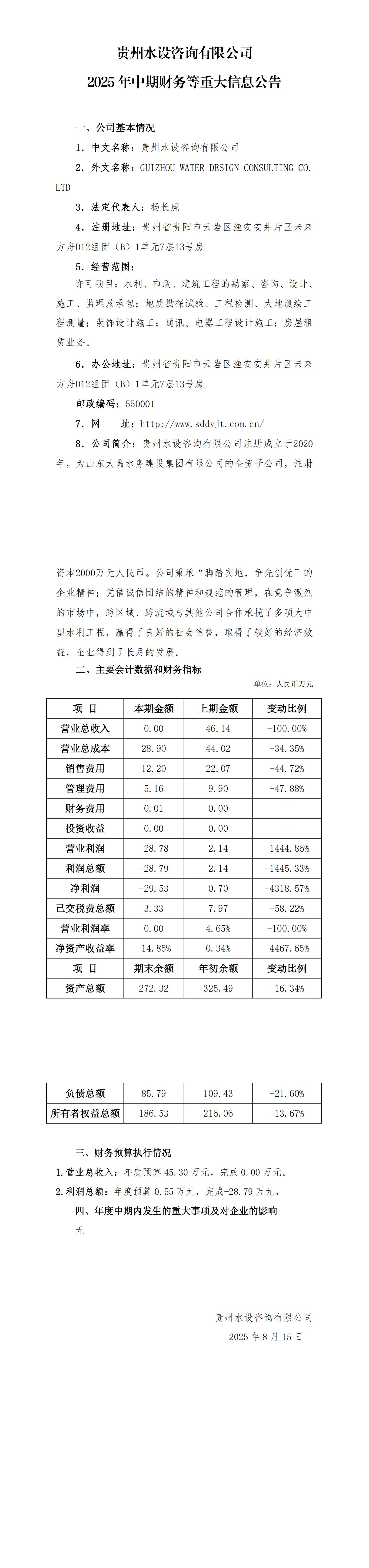 貴州水設咨詢有限公司2025年中期財務等重大信息公告