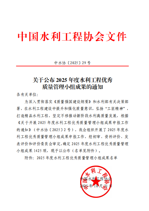 近日,中國(guó)水利工程協(xié)會(huì)公布了“2025年度水利工程優(yōu)質(zhì)質(zhì)量管理小組”評(píng)審結(jié)果,集團(tuán)公司申報(bào)的“提高波浪樁施工驗(yàn)收一次合格率”等六項(xiàng)成果經(jīng)過(guò)了初審、資料評(píng)價(jià)、發(fā)表評(píng)價(jià)和評(píng)審委員會(huì)審定,最終全部上榜。其中,3項(xiàng)成果榮獲I類(lèi)成果,1項(xiàng)成果榮獲Ⅱ類(lèi)成果,2項(xiàng)成果榮獲III類(lèi)成果。