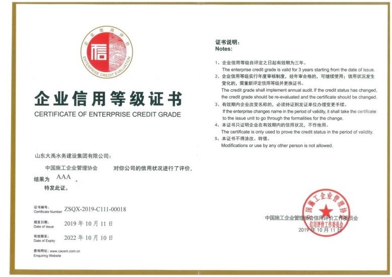 企業(yè)社會(huì)信用評(píng)價(jià)工作政策性強(qiáng)、關(guān)注度高,是企業(yè)進(jìn)行市場(chǎng)準(zhǔn)入、投標(biāo)資格審查、行業(yè)評(píng)優(yōu)評(píng)先的重要依據(jù)之一。中國(guó)施工企業(yè)管理協(xié)會(huì)信用評(píng)價(jià)工作委員會(huì)通過對(duì)大禹集團(tuán)的生產(chǎn)經(jīng)營(yíng)、財(cái)務(wù)狀況和質(zhì)量安全等進(jìn)行綜合評(píng)價(jià),最終授予大禹集團(tuán)“工程建設(shè)企業(yè)社會(huì)信用評(píng)價(jià)AAA企業(yè)”榮譽(yù)稱號(hào)。