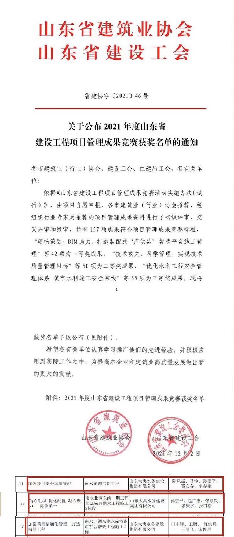 12月2日,2021年度山東省建設工程項目管理成果競賽獲獎名單揭曉,經行業專家的初級評審、交叉評審和終審,全省共有157項成果符合項目管理成果競賽標準。其中,大禹集團“加強項目安全風險管理”、“精心組織 優化配置 凝心聚力 勇爭第一”、“加強項目精細化管理 打造精品工程”三項成果榮獲“2021年度山東省建設工程項目管理成果三等獎”。