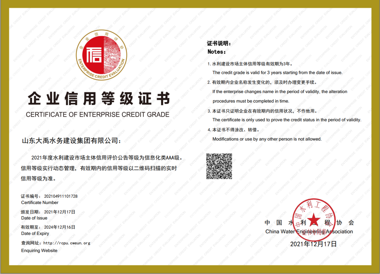 喜報!大禹集團獲評2021年度水利建設市場主體信息化類AAA級企業