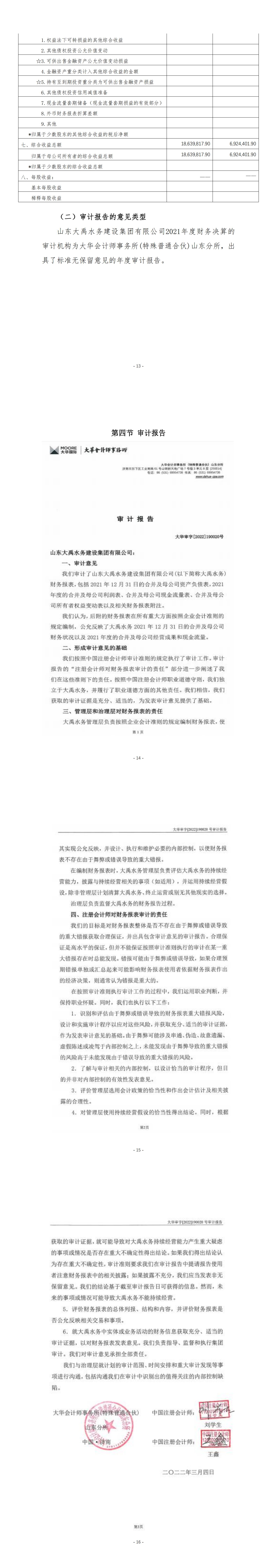 山東大禹水務建設集團有限公司2021年度財務重大信息公告